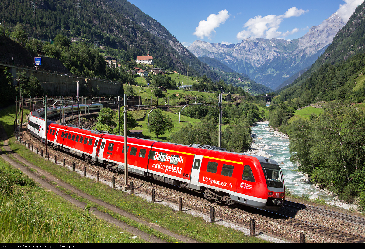 | Diesel tilt train 612 901/902 of Deutsche Bahn Systemtechnik in Minden, together with Intercity tilt train ICN RABDe 500 022 "Expo 02" of the SBB, on a test run through the 300 meter radius Wattinger curve near Wassen. Velocity was probably about 95 km/h. |