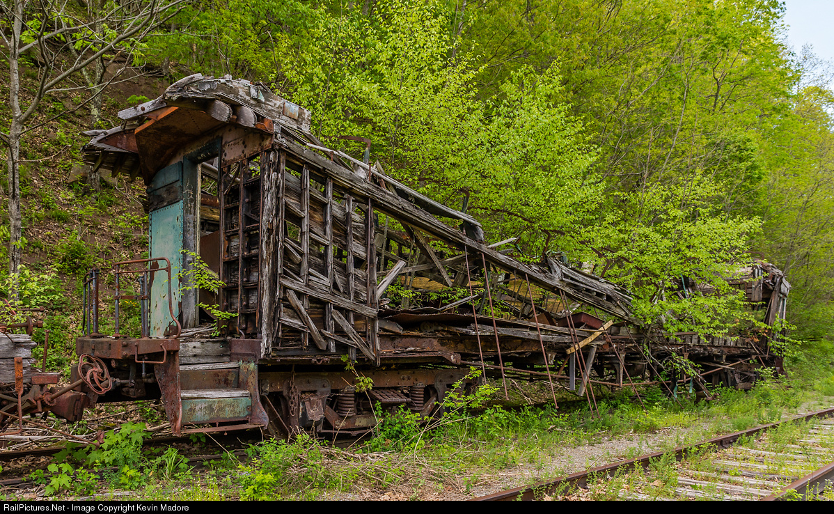 The best evidence seems to indicate that this car spent its last years on the fabled Buffalo Creek and Gauley, which was the last regular steam railroad in the US. The car was apparently built by Harlon & Hollingsworth of Wilmington, DE in the 1880's for the Philadelphia and Reading RR. How many times it changed hands before getting to the BC&G is anyone's guess. Photos exist on the internet of this combination car at the BC&G, lettered "X-6", which would have been a maintenance-of-way designation. These photos also show the words "Dining Car" on the side of it, and interior shots suggest that it was used as a kitchen on wheels to feed MOW crews. The photos show that as late as 1961, the car was in good shape for an 80-year old piece. After the BC&G folded, this car may have changed hands a couple of times, before being donated to the Cass Scenic Railroad in 1967, in good condition. Unfortunately, it was neither protected, nor well-cared-for, and eventually, the roof became compromised. Once that happened, mother nature began to eat Combine X-6 for lunch. Except for the end walls at the platforms, the steel sheathing is gone now, and the wood frame is rotting away. The steel bracing rods appear to be all that is keeping it from totally collapsing into itself. Fifty years ago, this unit was a museum-quality piece, just waiting for someone to save it. In another 50, it will likely be little more than a magnetic anomaly along the Greenbrier River.