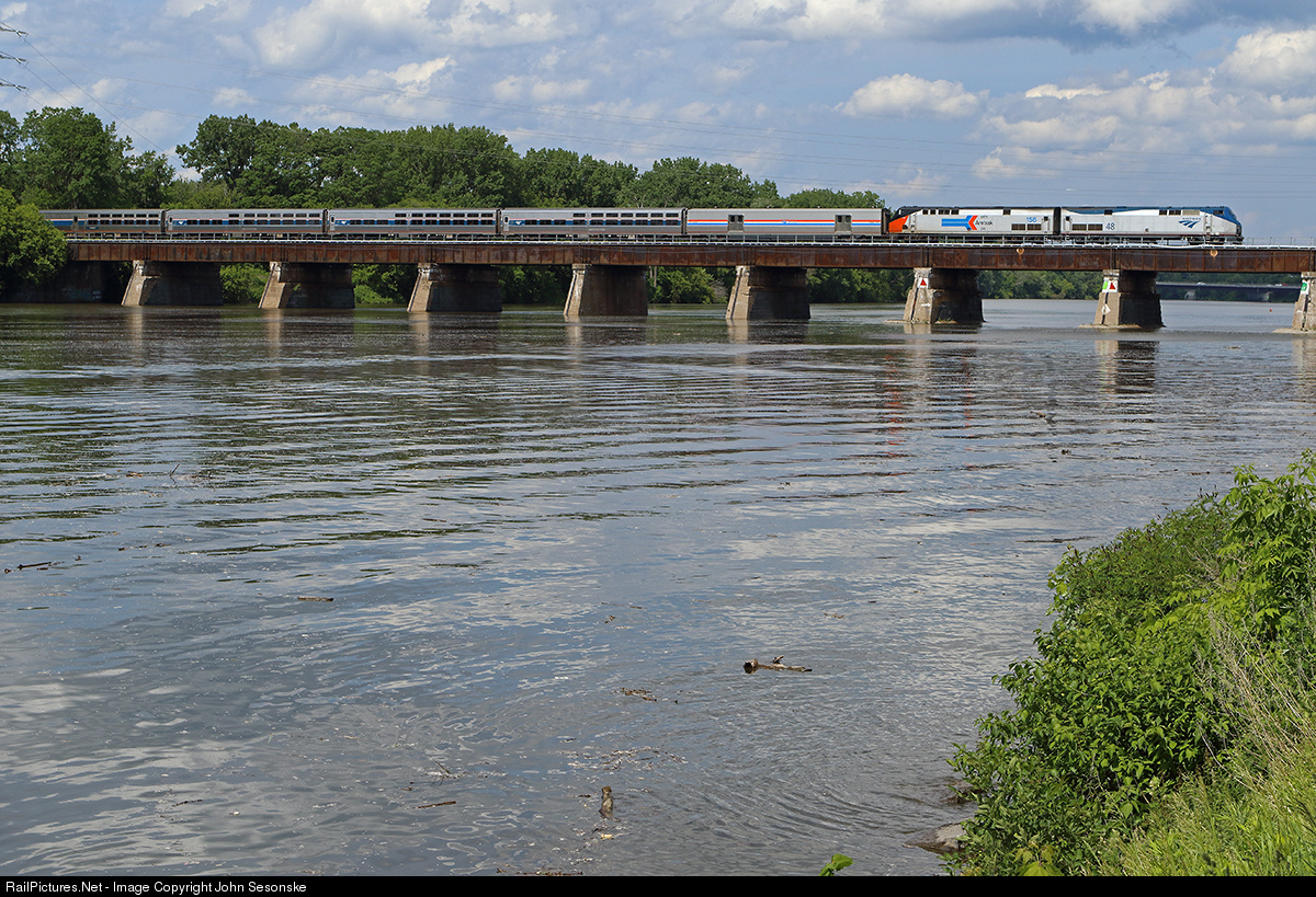 Amtrak engine 48 leads train number 48, The Lake Shore Limited, across the Mohawk River on the old NYC Water Level passenger main. Trailing unit is the Phase I heritage followed by 5 Viewliners that include a baggage, 3 sleepers and the prototype diner Indianapolis.