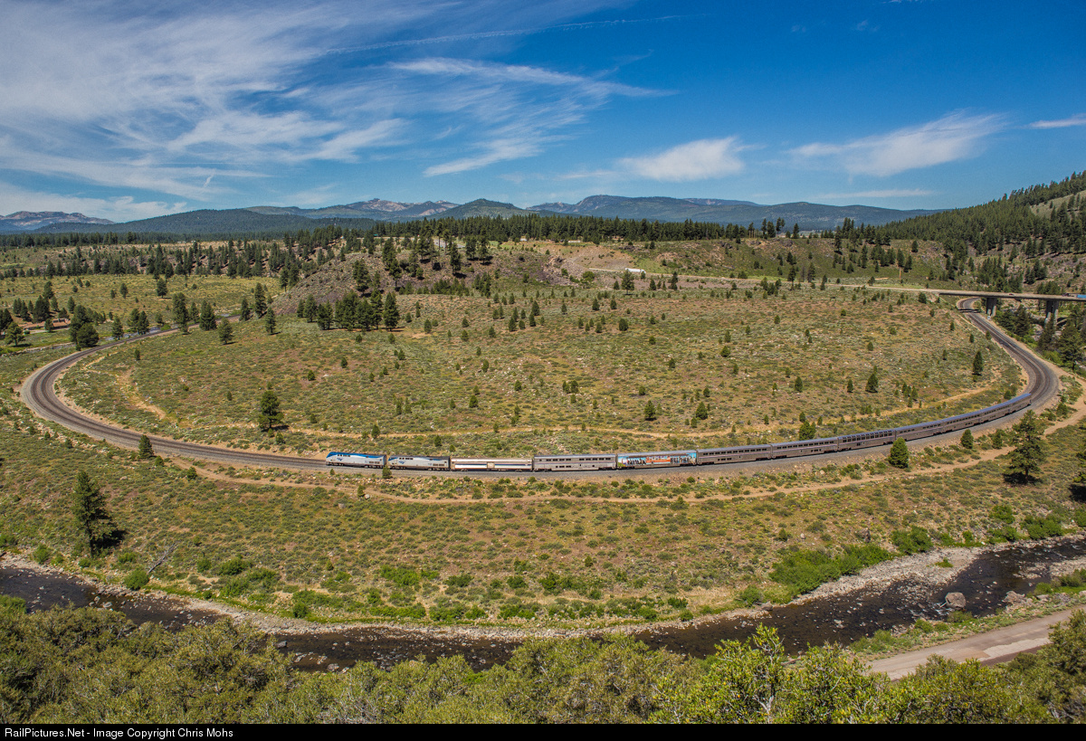 | Westbound Amtrak No.5, the California Zephyr, rounds the horseshoe curve at Flycasters Flat Ahead lay the grades up to Donner Pass in the distance. The Truckee River and old highway 40 are in the foreground. Highway 80 crosses the Railroad and river in the upper right. |