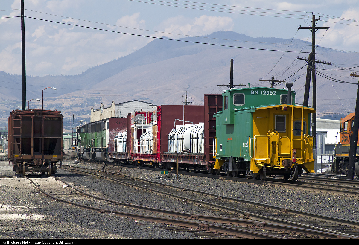 | BNSF 12562 brings up the rear of a BNSF fire train which they brought into Wenatchee and stationed it on the main just in case after a major wild fire broke out near their tracks west of Wenatchee near MP 1654 Sunday pm about 2 pm local time. The fire grew to over 1800 acres and destroyed approx. 28 homes by Monday morning. Over 1000 were evacuated including our family. The fire spread along the railroad for about a mile, but mostly moved up the hill side. Embers are believed to have started a major structure fire at Stemilt Fruit, about a mile north of this photo, which closed the railroad. At this submittal the railroad remains closed. |