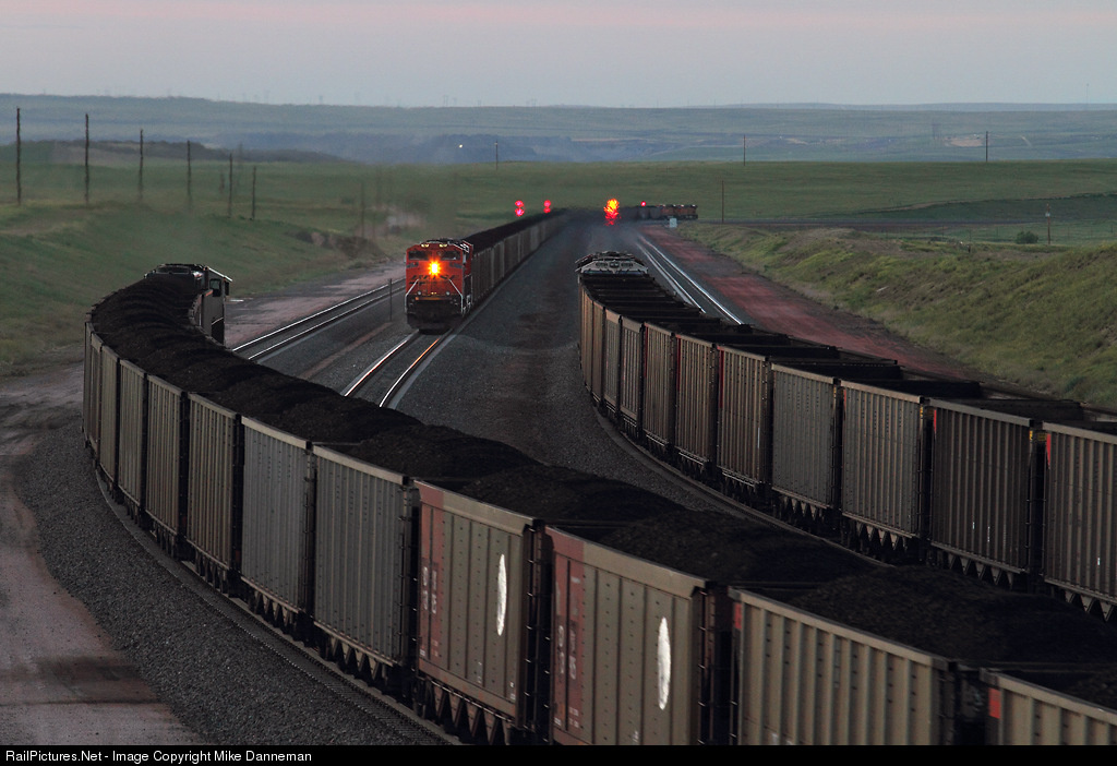 As dusk settles in over Powder River Basin at 8:49 p.m. on June 18, 2015, a BNSF coal load dims its lights for a northbound empty as it chases the DPU of another southbound BNSF load on top of Logan Hill, Wyoming.