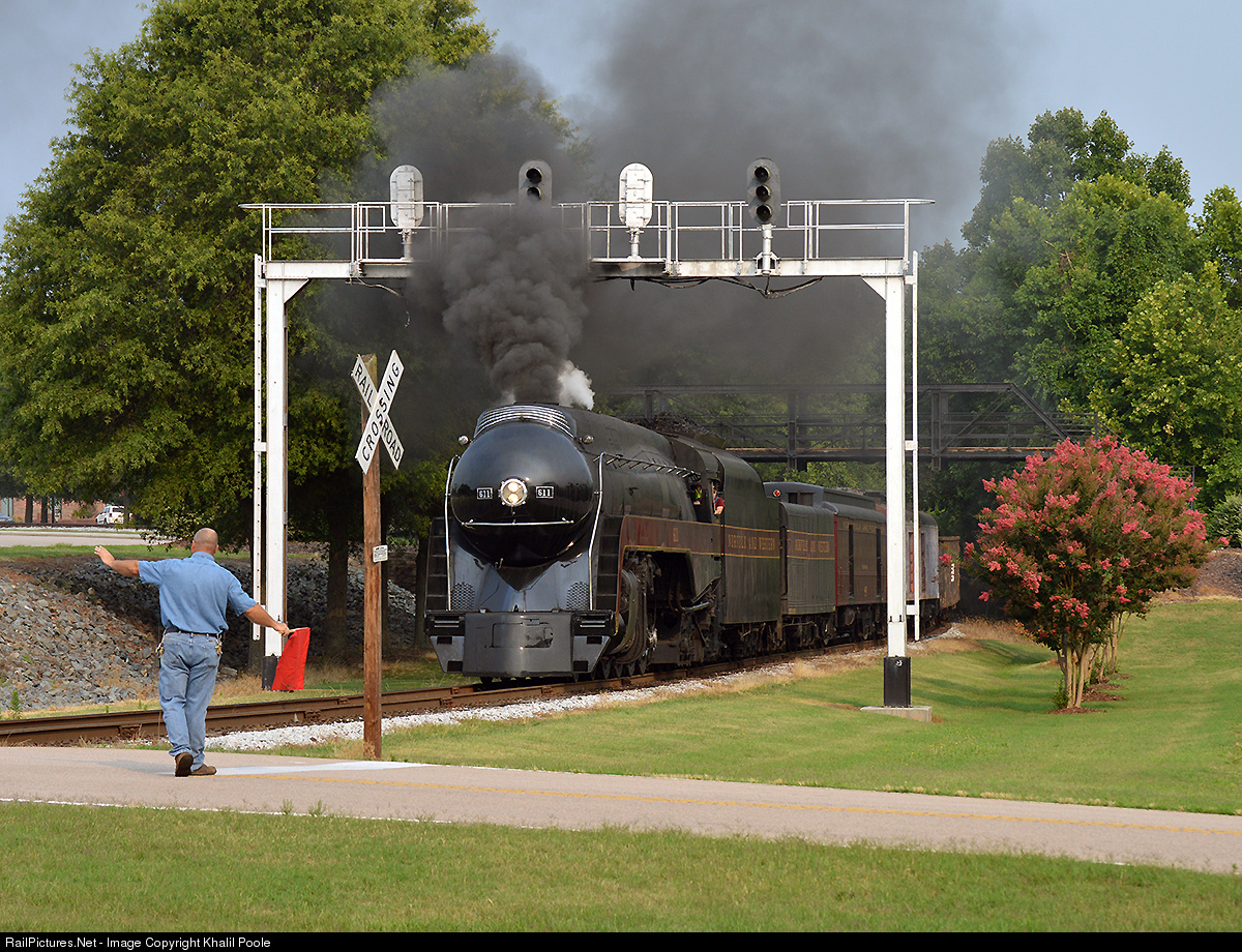 | It's as if time itself has stopped. We see N&W 611 on her way back home to Roanoke once again for an upcoming excursion ducking underneath the classic SOU signals with a flagman protecting the crossing just like how it use to be long before automatic warning devices were born. |