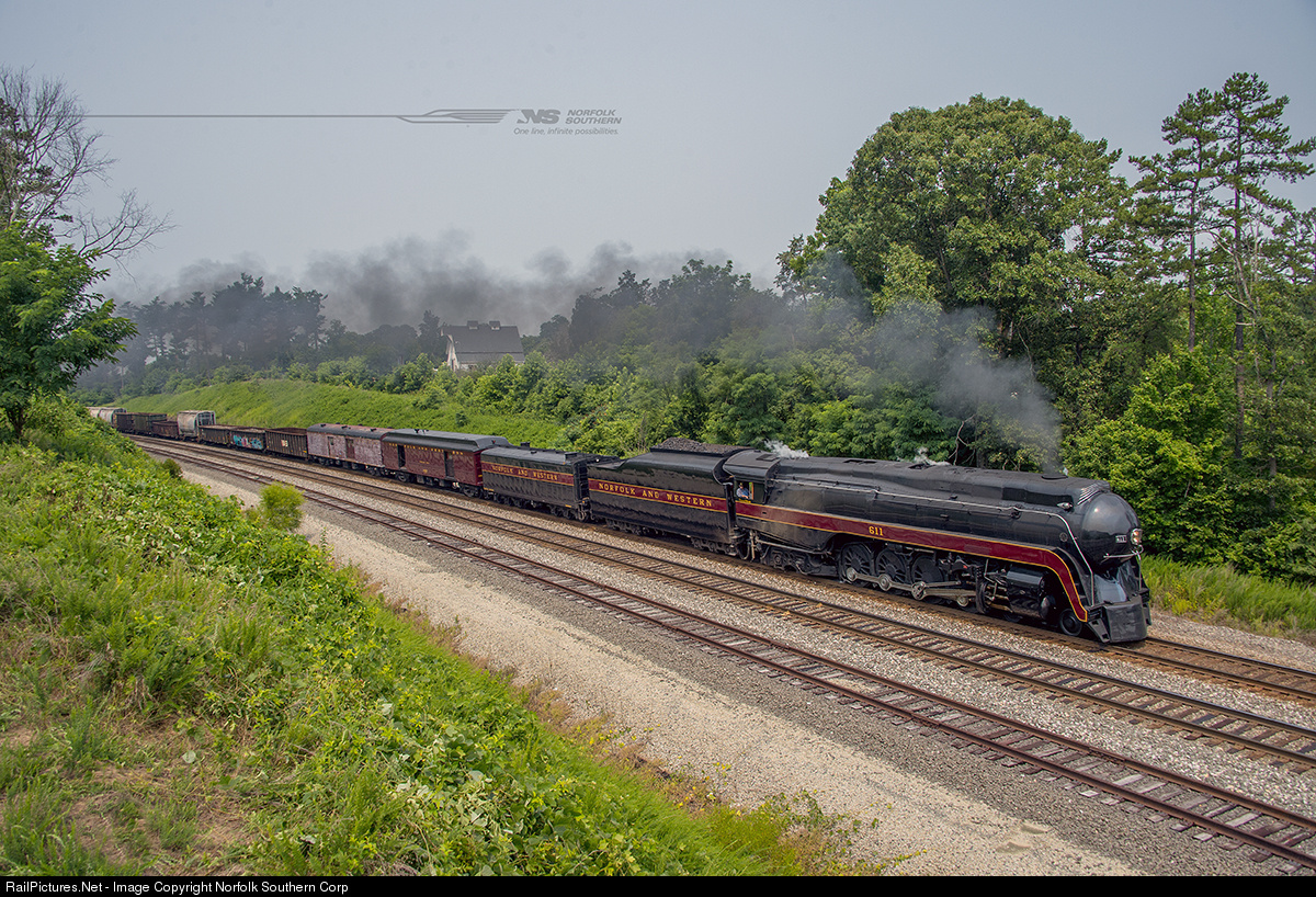 Norfolk and Western class J number 611 leads train 957 through Jamestown, North Carolina on a deadhead move from Spencer to Roanoke. 611 was pulling 13 cars: the auxiliary water tender, two tool cars, a load of coal, and nine revenue freight cars. Photo by Casey Thomason. For more information about Norfolk Southern, visit www.nscorp.com