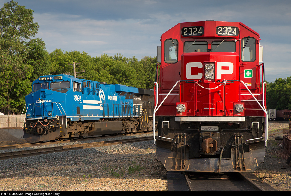 NS 8098 passing one of Canadian Pacific's newest GP20C-ECO locomotives (this one is assigned to the Hastings Patrol).