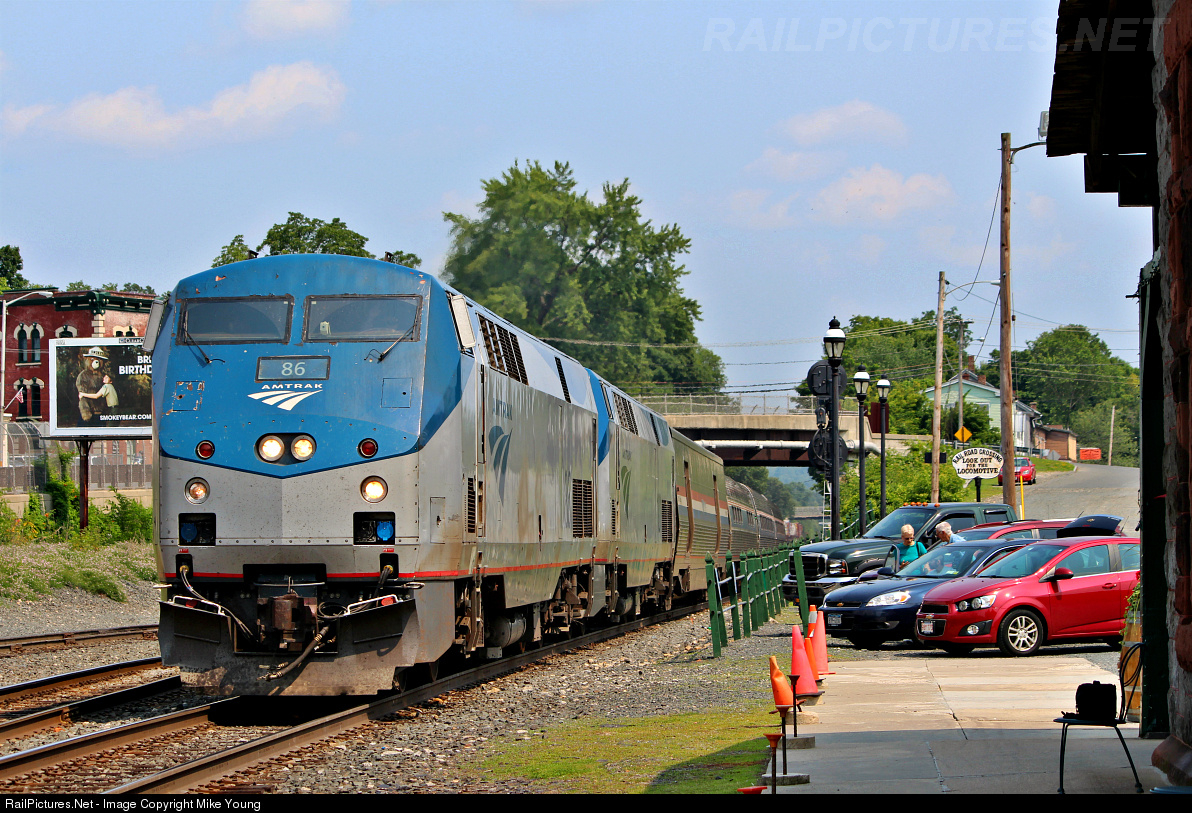 | Just before 3pm, Amtrak P449, The Lakeshore Limited, rolls westbound during a busy lunch hour at the steaming tender. |