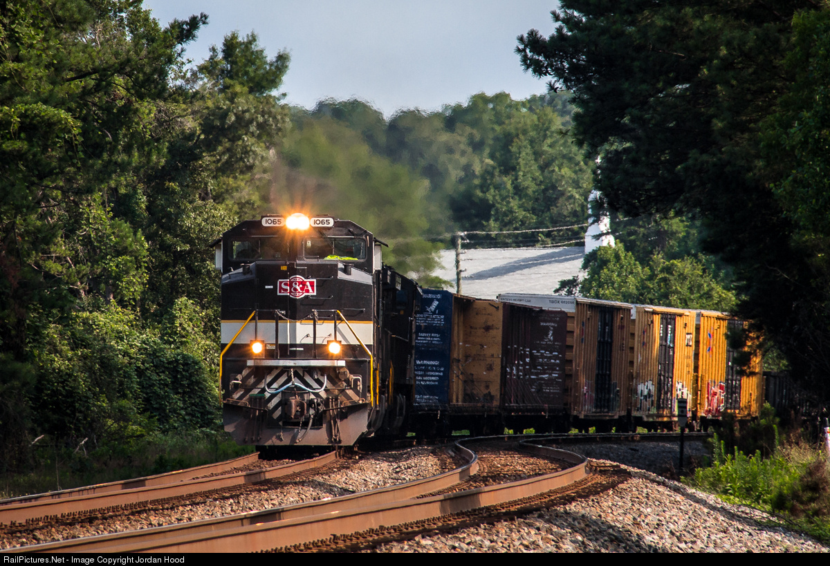 | Norfolk Southern's Savannah & Atlanta heritage SD70ACe, in the sharp Southern Railway tuxedo scheme, leads manifest 153 down the old Washington to Atlanta mainline on a muggy July morning. |