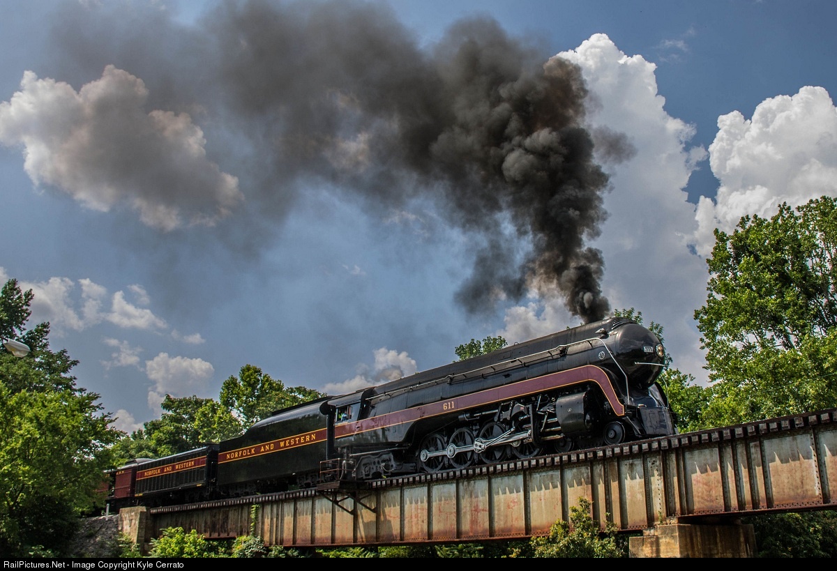 | Norfolk and Western 611 works hard to pull its long consist of passenger cars out of Petersburg, VA putting on a nice show for the trackside railfans. Seeing 611 work on her own was a sight to behold, especially now-a-days with all the diesel assistance other steam excursions get. |