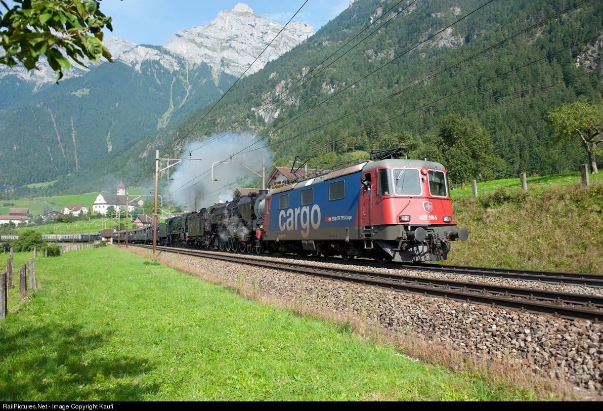 | On a warm day at the end of September 2013, the two huge french steam locomotives 241 A 65 and 241 P 17 pulled a long train over the Gotthard line. Because of all the tunnels, they needed electric help. Unfortunately this help was not any historic engine, but an Re 420 from SBB Cargo - not necessary to mention, that a lot of people were pretty much disappointed... |