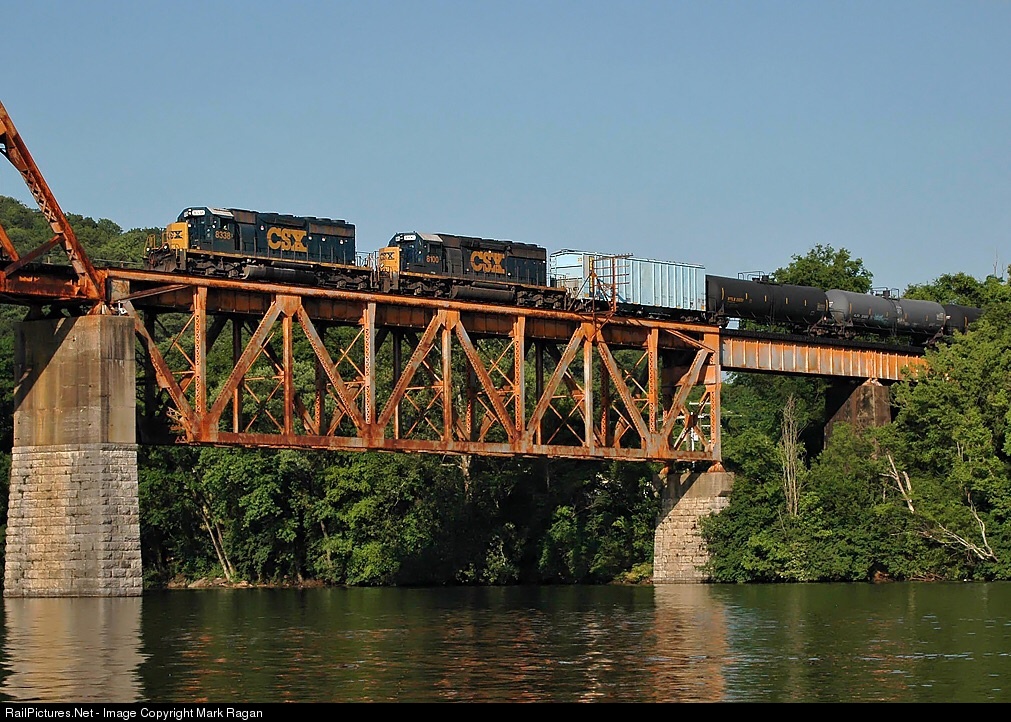 | Two EMD SD40-2 locomotives lead a train of ethanol empties across the bridge that CSX painted orange in support of the University of Tennessee Volunteers. The second trailing locomotive had died south of Knoxville, leaving a single SD40-2 as sole power for the trip all the way to Corbin, Kentucky. |