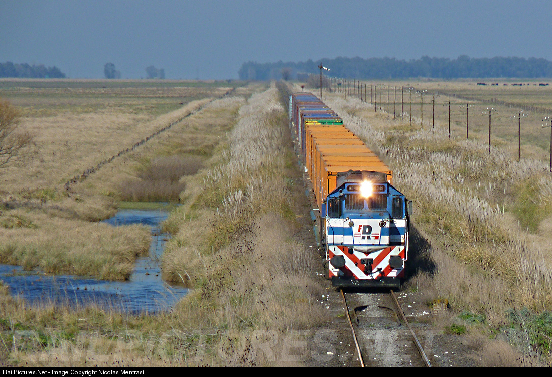 | Container train from Bahia Blanca is arriving to the Querandies juction where the left track joins to the main track from Lamali factory. The train ahead with a GT22 #9048 will be arrive to Olavarria city and waits to continue on their route to Buenos Aires. |