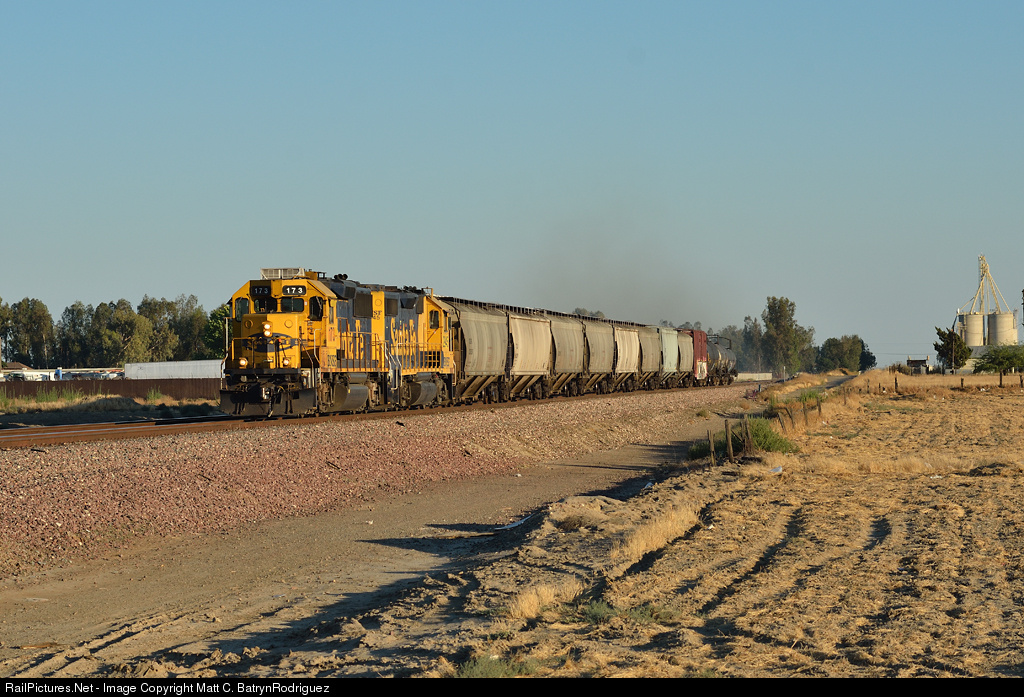 | After having completed switching industries located within the Kings Industrial Park, the BNSF Evening Kings Park Job heads passes through Hanford on its way north to switch the industries located at Conejo. |