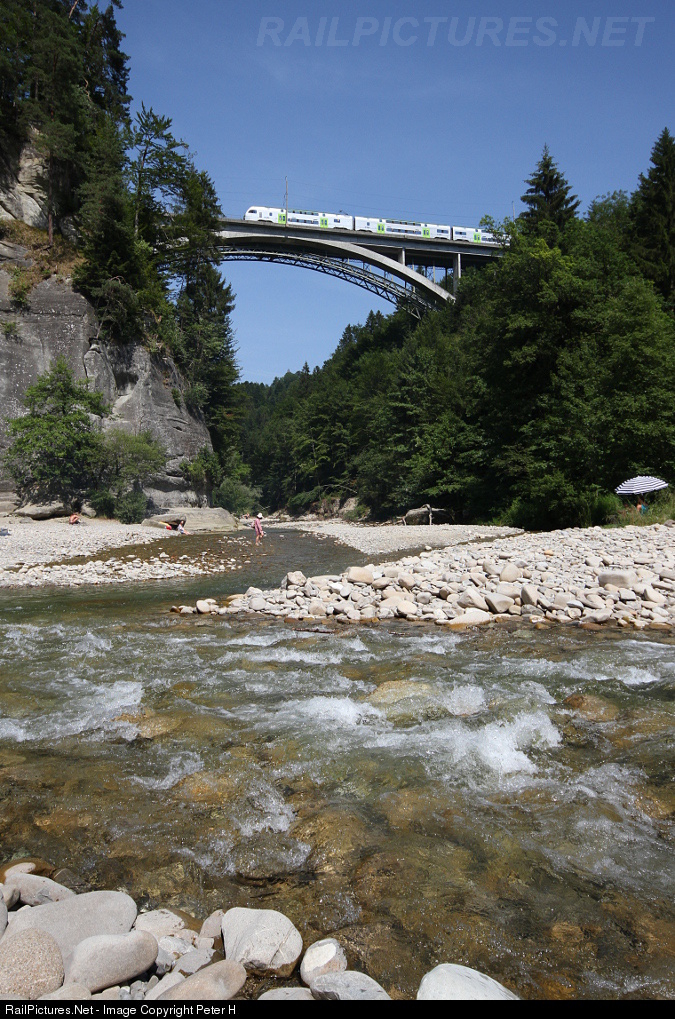 | On the mouth of the river Schwarzwasser into the river Sense two bridges span in a height of 65m over the deep cut. In front the 1977-1979 built concrete railway bridge (which replaced an older steel one), and directly behind (barely visible) the 1881-1882 built steel road bridge. The protected landscape is in summer times a beloved swimming and picnicking area - especially on such hot times as we have currently. While some swimmers enjoy the rivers a regional train of type RABe 515 is crossing the bridge on its way to Schwarzenburg. |