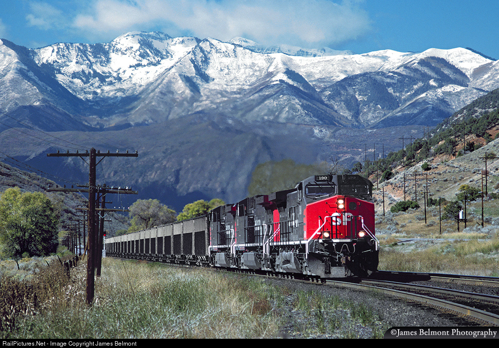 A trio of Southern Pacific AC4400CWs lead an Intermountain Power to Skyline coal empty through Spanish Fork Canyon on Oct. 8, 1997. The dramatic background is courtesy of 10,689 ft. Loafer Mountain.