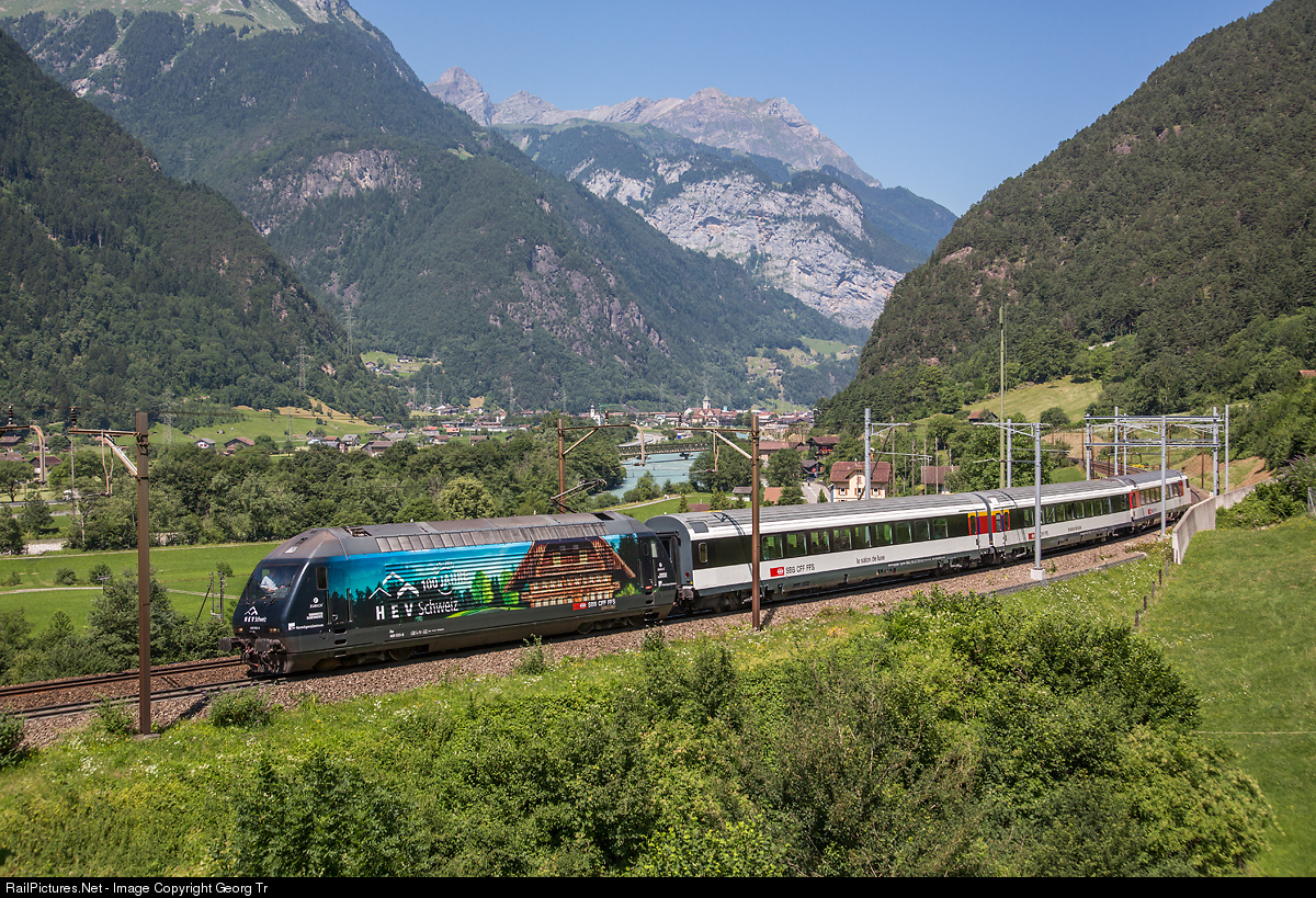 | Re 460 023 with publicity paint scheme for Swiss Homeowner Association (Schweizerischer Hauseigentümer Verband HEV) with a short push pull train, including two parlor cars "Salon de Luxe" and a cab car Bt, with a charter train from Lucerne to Locarno, on the Gotthard line above Erstfeld. |