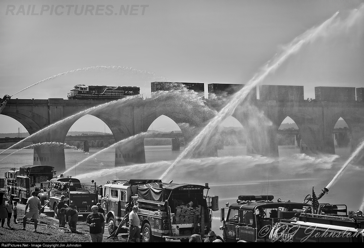 The NS 911 "Honoring First Responders" unit on the Reading Bridge under a salute of water streams at the 40th annual Pennsylvania Pump Primer Fire Muster event. Fire trucks lined the Susquehanna River as part of the pumping competition for antique apparatus. Norfolk Southern brought their engine to honor the first responders at the event.