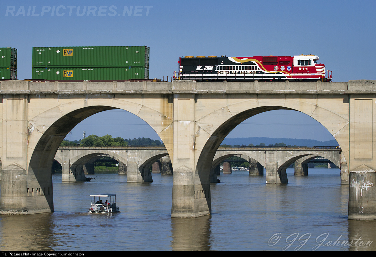 | The NS 911 "Honoring First Responders" unit on the Reading Bridge at the 40th annual Pennsylvania Pump Primer Fire Muster event. Norfolk Southern brought their engine to honor the first responders at the event. |