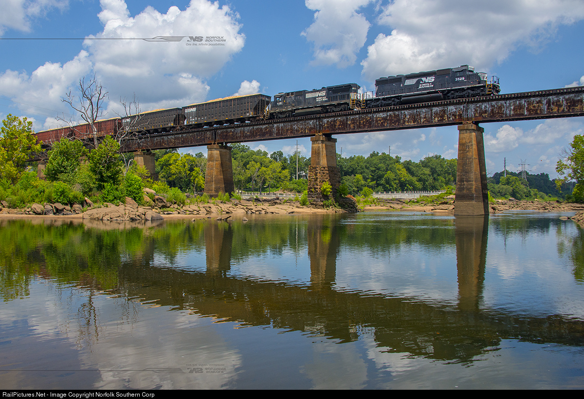 Alabama Division local train number A41 crosses the Chattahoochee River as it rolls back in to Columbus, Georgia, with loads of wood chips from a mill in Salem, Alabama. SD40-2 number 3529 was part of a batch of units acquired by NS about a year ago, which required the fleet of B32-8's to be renumbered from their 3500-series numbers, simply removing the "3" and retaining their last three digits. This photo illustrates why that renumbering was required, as the trailing unit is B32-8 number 529, formerly 3529, the number now held by the lead unit in this consist. Photo by Casey Thomason. For more information about Norfolk Southern, visit www.nscorp.com