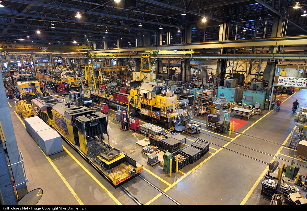 The main shop building at Union Pacific’s Downing B. Jenks Shop at North Little Rock, Arkansas, has a large group of locomotives in for rebuild and overhaul on May 18, 2015, including UP SD40-2 No. 3151 that will become a rebuilt SD40N.