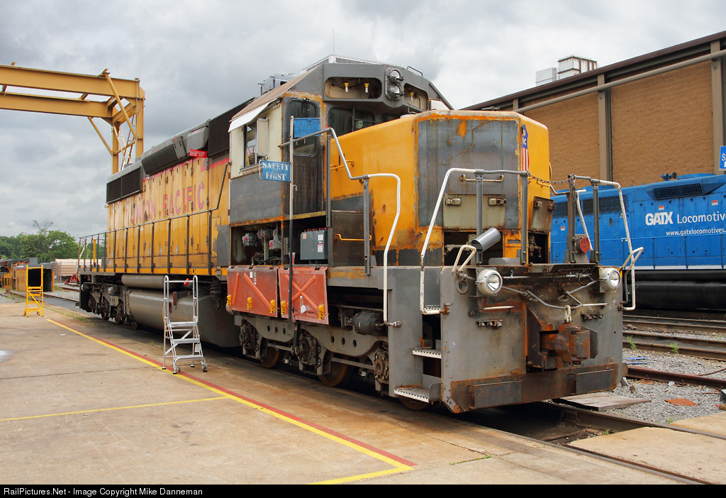 Union Pacific EMD SD40-2 No. 3299 undergoes a SD40N transformation in the rebuild program at Jenks Shop in North Little Rock, Arkansas. The “N” in the SD40N designation comes from the NEXSYS control system by ZTR Control Systems used by UP in the rebuild to replace the older EMD Dash 2 component cards and system. UP also installs a remanufactured prime mover, along with reconditioned main generator, traction motors, trucks and other major components during the process. The cab is completely rebuilt, replacing worn out and rusted portions, and adding new doors, air conditioning, PTC capability and rewired electrical cabinets. Another important aspect of the rebuild is that the locomotive becomes compliant with Tier 0+ standards required for all locomotives built from 1973 to 1992. On May 18, 2015, this SD40-2 “snoot” gets more work done outdoors near the north transfer table and is well on its way to becoming a “new” SD40N.