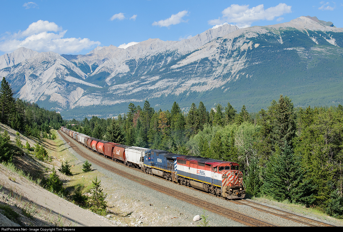 BCOL C40-8M 4624 and BCOL C44-9W 4652 lead a Coquitlam, BC bound grain train into Jasper.