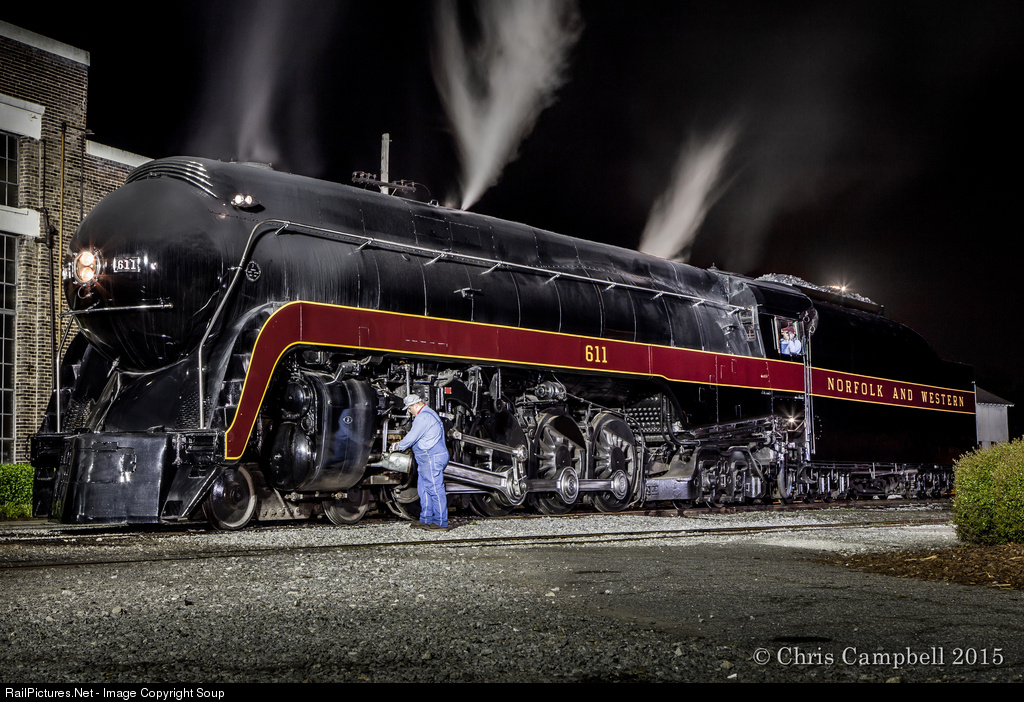 Well into the 14th hour of the Fired Up Photo Charter led by Jim Wrinn of Trains Magazine, 611 poses for the final staging of the event with Lucas Safrit, NC Transportation member, posing as an engine crew member servicing the locomotive. Early the next morning, volunteers would wash the locomotive in preparation for her triumphant return to Roanoke on Saturday, May 30th.