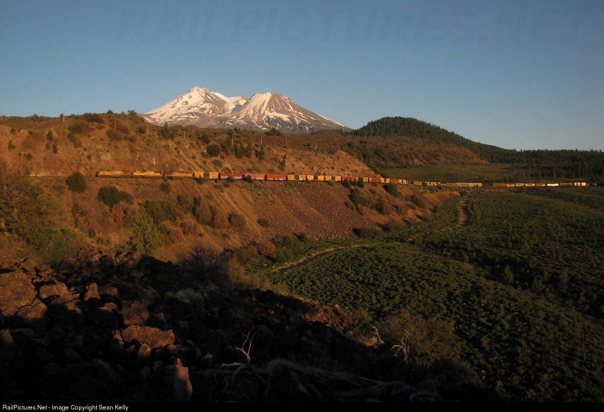 Lost in the lava flows: As the shadows grow long and the sun dips towards the horizon behind me, the peace and quiet in the remote desert below California's Mount Shasta is disturbed by a northbound Union Pacific manifest as it battles the grade between Hotlum and Bolam.