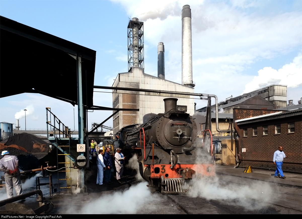 | Sappi Saiccor's No.3 hisses away peacefully the cacophony of the paper mill while the fitters try solve a problem with the reverser. The worker on the right is lost in the magic of his cell phone - maybe he doesn't know that it is five minutes to midnight for South Africa's last two steam engines in daily, revenue-earning service. There are just weeks to go before No.3's fires are dropped for the last time. And then ... who knows? Picture taken with permission. |