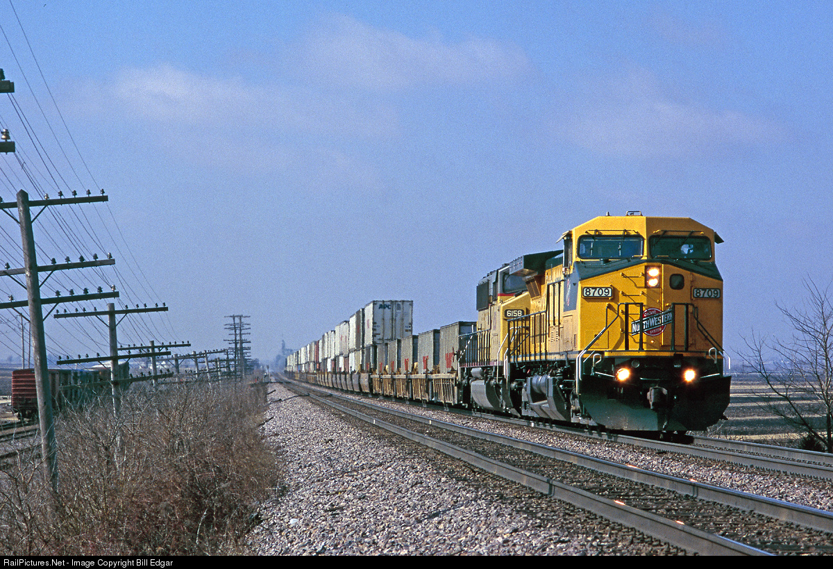 | Former CNW 8709 leads UP SD60M 6158 on an APL stack train rolling eastbound into Rochelle, IL en route to Chicago. To the left is the Del Monte plant, and behind it a corn field that is now the site of UP's Global 3 intermodal operation, approximately 75 miles west of Chicago. |