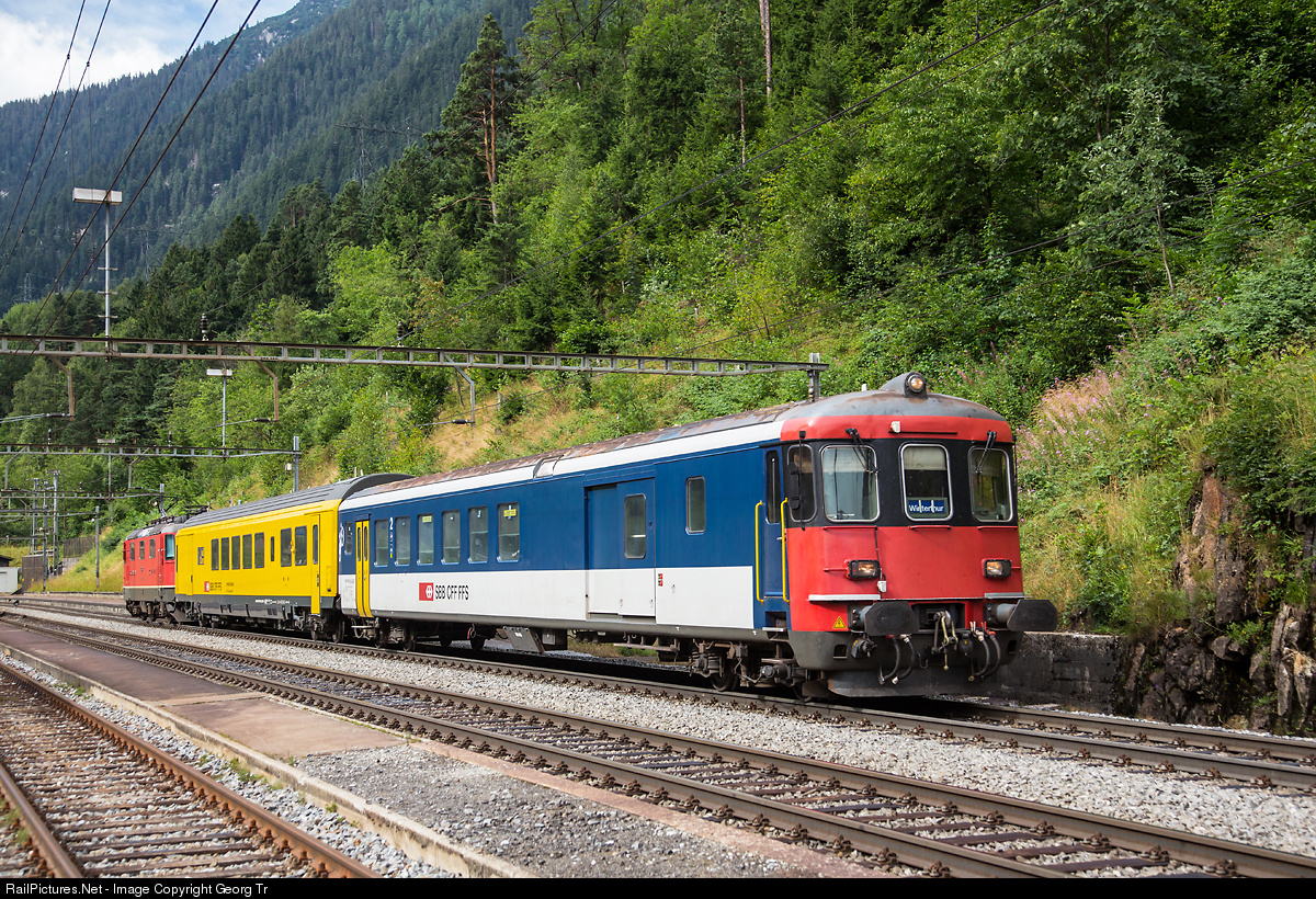 | The radio test train passing Wassen on the Gotthard north ramp, with cab car BDt 50 85 82-33 925-7, "Rail Com" test car X 60 85 99-90 109-9 and locomotive Re 4/4 II # 11301 shoving in the rear. |