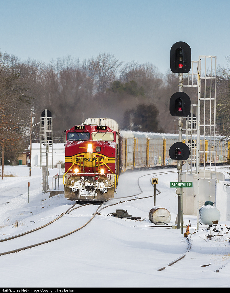 After a fresh snow, BNSF Warbonnet 788 leads the NS 272 south through Stoneville on a cold winter morning.