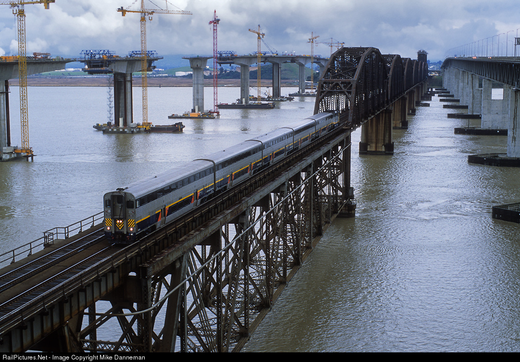 An Amtrak Capital Corridor train crosses Benicia Bridge over Carquinez Strait between Martinez and Benicia, California, on March 12, 2006. In the background, a new I-680 bridge is being built across the strait.