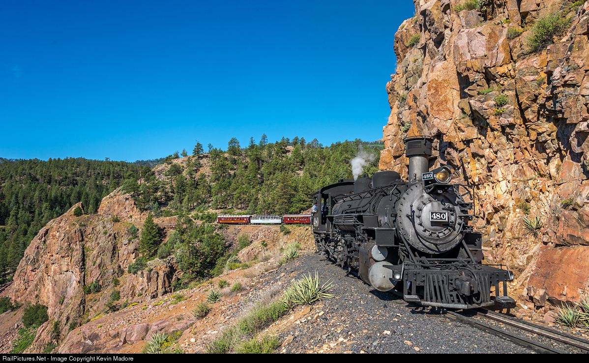 Hugging the rocky cliffs, Train 462 snakes its way around Rockwood, Colorado's famous High Line Horseshoe Curve, on its way north to Silverton. Locomotive 480, a Baldwin K-36 Mikado, is just tip-toeing here, observing the permanent slow-order, while the entire crew keeps a keen eye out for anything untoward. Guard rail lines the ROW for most of this stretch of track....just in case. Of all of the places on the line from Durango to Silverton, this is the one place they don't want to have a problem. Just off to the left is an extremely steep cliff, dropping away roughly 400 ft to the Animas River below.