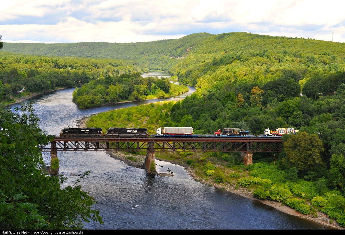 The annual Strates Carnival train is seen crossing the Mill Rift bridge from Sparrow Bush, NY to Mill Rift, PA. The train is making its once yearly run up the Southern Tier and has recently proved to be the only "regularly scheduled" daylight freight on the Tier. Powering the train was a pair of NS GE's the latter of the two being a standard cab - a welcomed site on the Tier! |