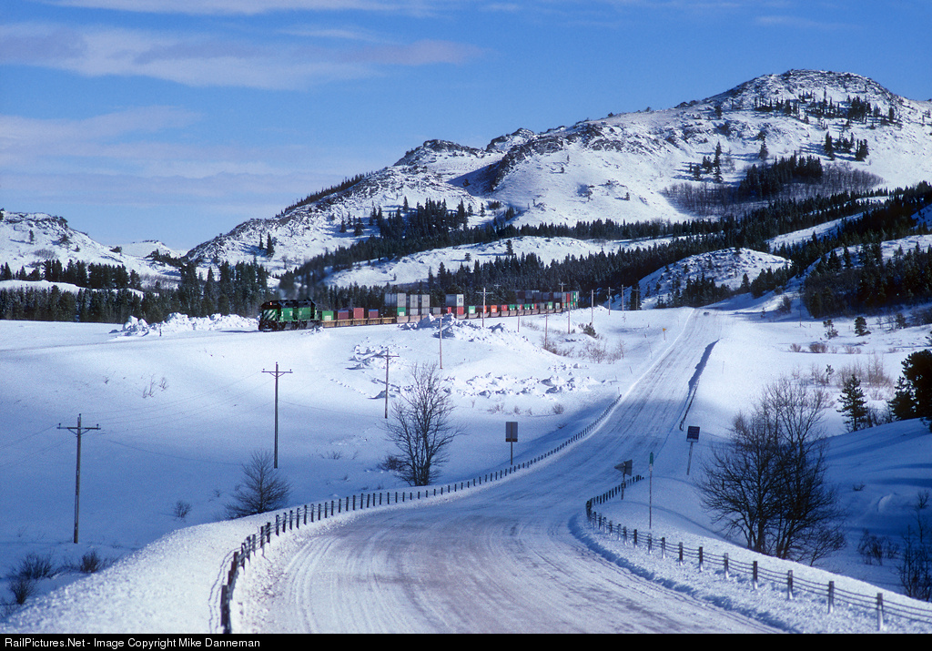 Pacing a nearly deserted and icy Highway 2, a westbound Burlington Northern Santa Fe stack train rumbles through Bison, Montana, on a cold March 2, 1997. The train is climbing the east side of Marias Pass on the BNSF Hi Line.