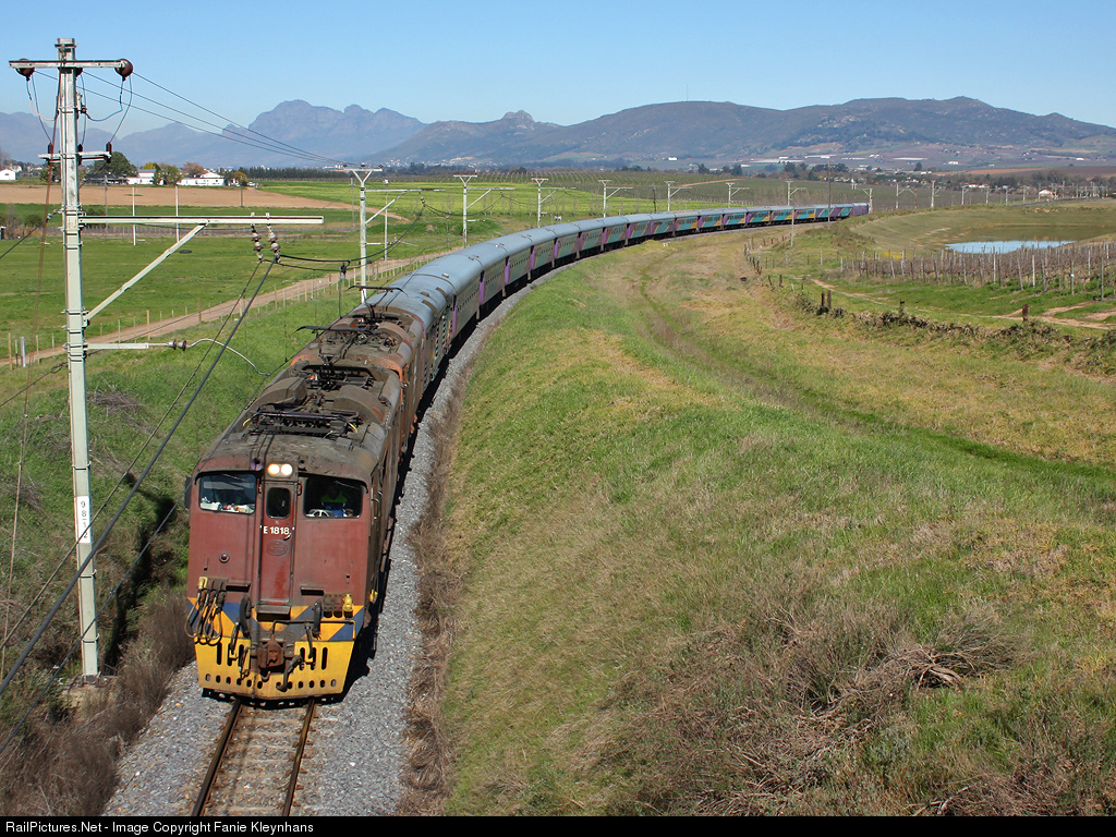 | The Transkaroo from Cape Town to Johannesburg slowly gets up to speed again after a stop at Wellington, with a faded E1818 leading. |