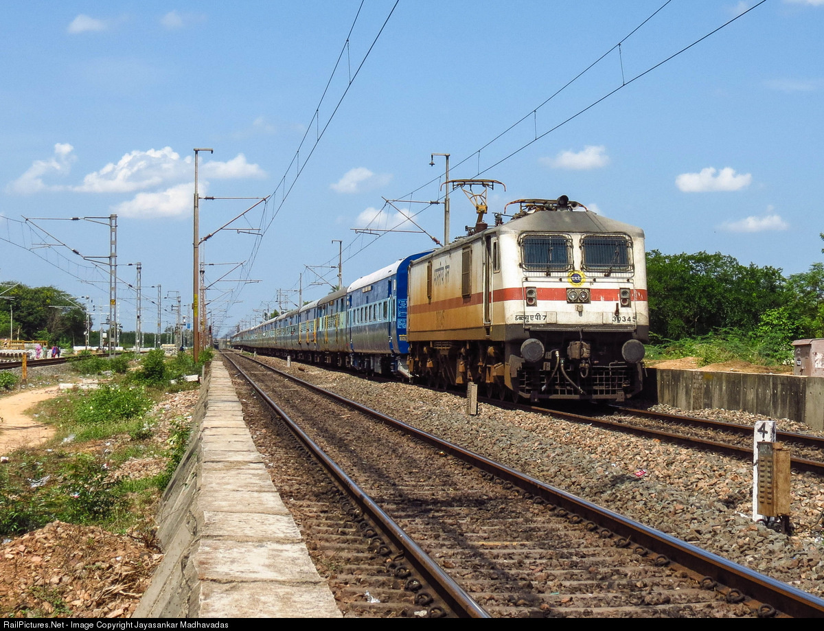 On a sunny afternoon , LALLAGUDA WAP-7 in charge of Chennai Central - Bangalore city Express with an extra load of an overhauled coach |