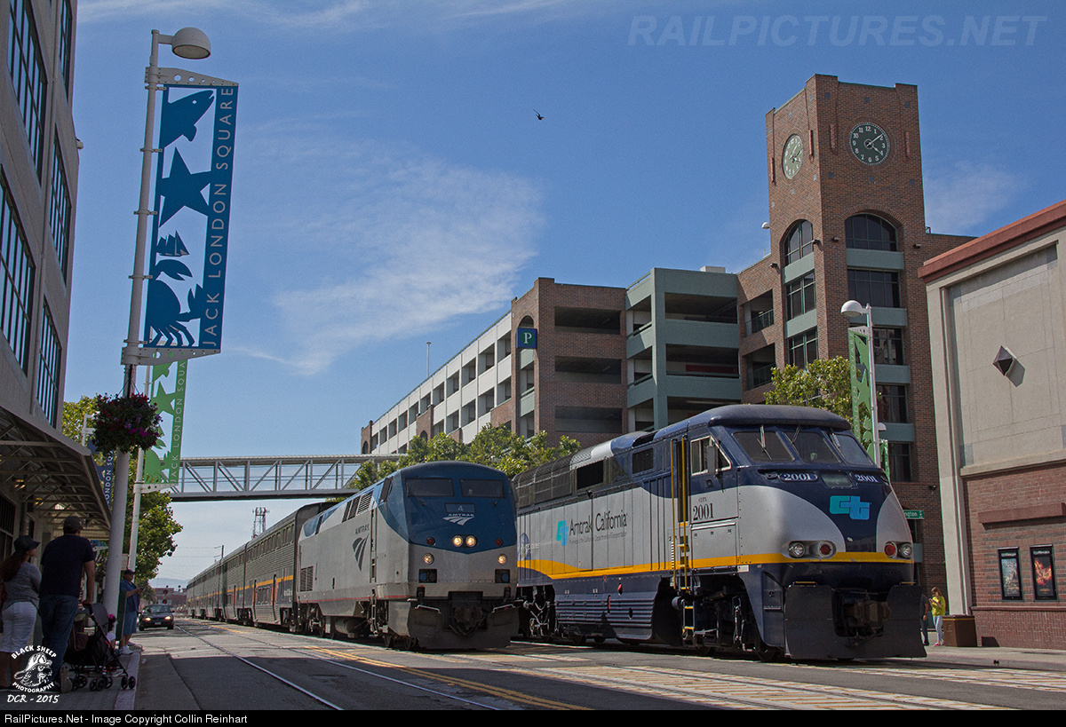 | An inbound Amtrak California Capital Corridor train behind a standard P42 passes an outbound train that developed engine problems and stalled out before leaving Jack London Square.