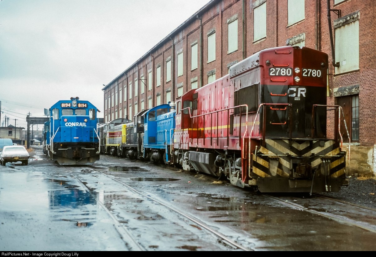 I only ever visited the former CNJ shops in Elizabethport, NJ a few times, but there was always an interesting assortment of power there when I did. Here a GP38-2 fronts an all blue consist, still somewhat unusual at this date. On the other track, EMD switchers of Lehigh Valley, Penn Central, and Erie-Lackawanna lineage are bracketed by an ex-LV U23B and a New Jersey Transit E8 from the Penn Central.