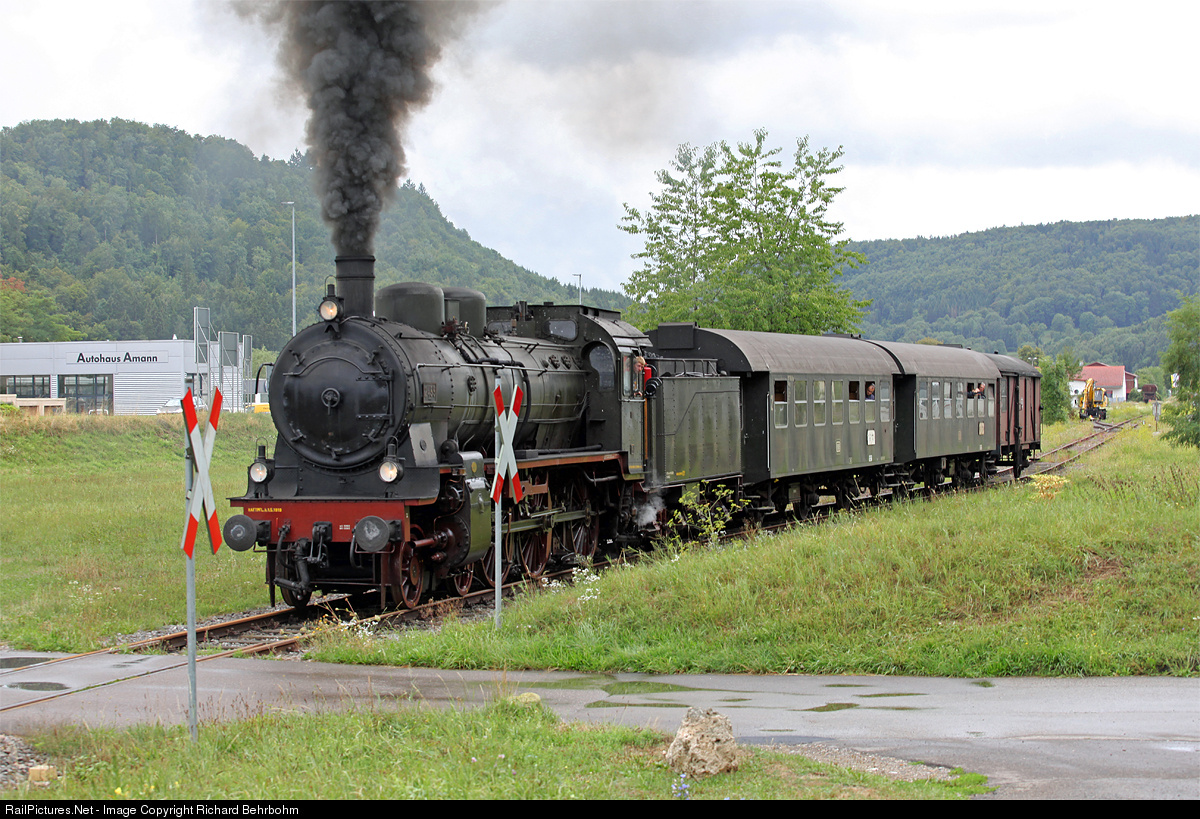 | This is the first year on the Sauschwänzlebahn, that on some days trains are running Blumberg – Stühlingen. With the afternoon train, P 8 2455 is leaving the former station Stühlingen (closed for passenger service in 1971). |