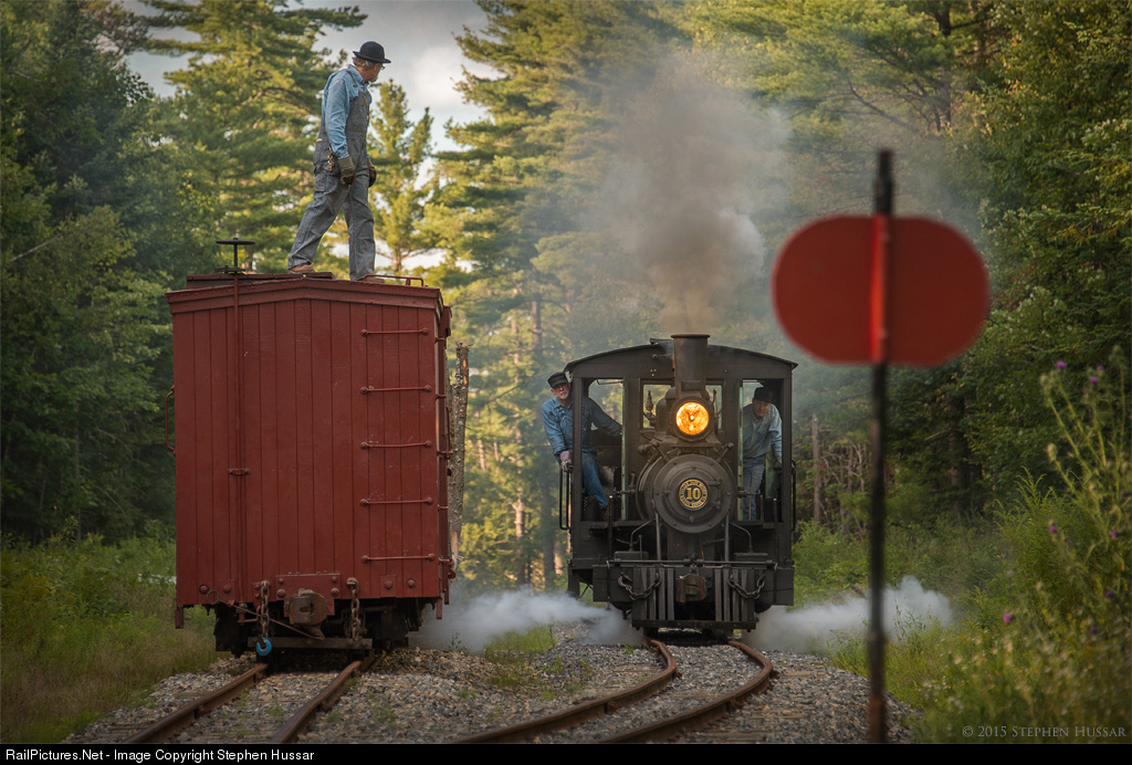 The end of the day finds brakeman Bill Baskerville waiting atop boxcar 309 to release the brake. Meanwhile engineer Gordon Cook, and fireman Joe Fox bring WW&F Ry No 10 around their train at"Top of the Mountain." Autumn Work Weekend is coming right up, October 9th thru 12th this year (2015). Make plans now to join us in Maine! www.wwfry.org