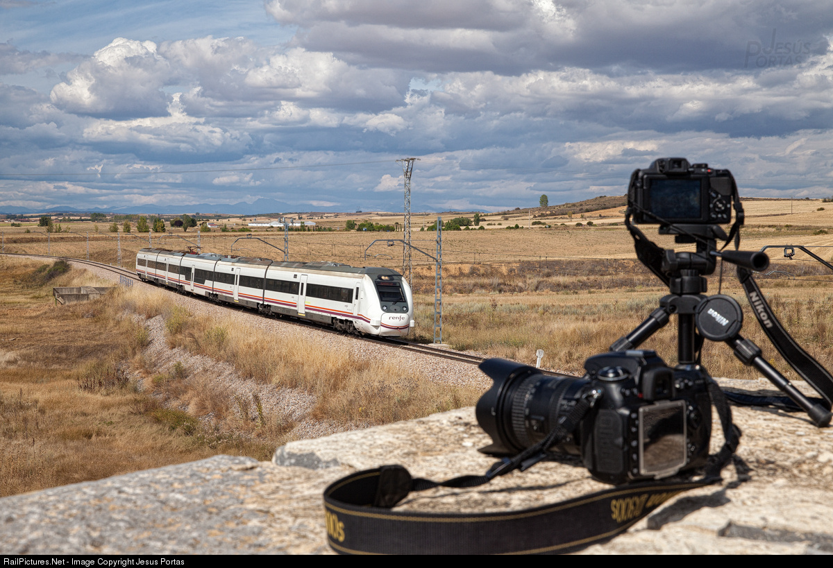 Photographic material waiting for the passing of a freight train. Meanwhile one CAF 449 unit makes a medium-distance service from Leon to Madrid.