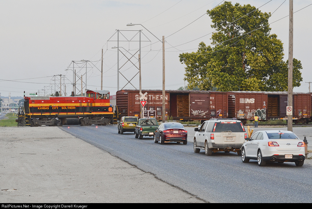 | KCS 4347, in the last light of day, shoves south across Front Street back to Knoche Yard as motorists wait their turn. |
