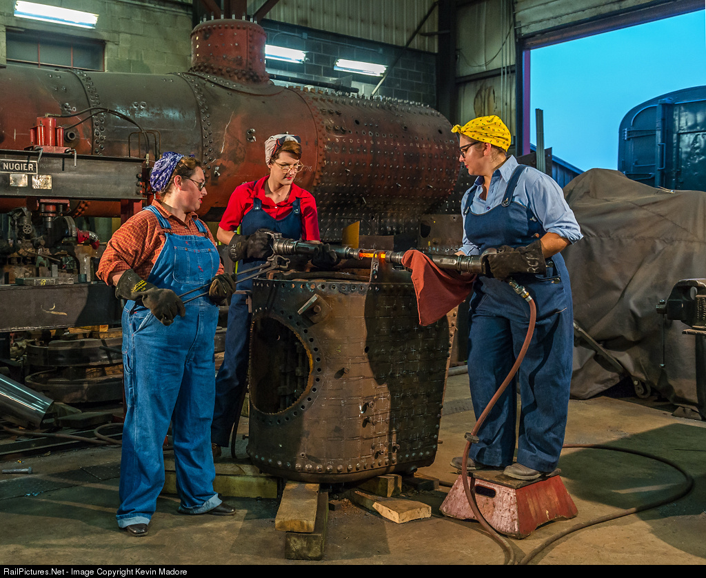 Buckin' rivets. After placing a cherry-hot rivet into the steam chest of a locomotive under repair, a railroad shop material handler watches as her two colleagues hammer that rivet into place. During World War II, the iconic "Rosie the Riveter" became the symbol of the strength and power of Americas female workforce. Pressed into occupations that most of them never envisioned in their youth, the women from this country built airplanes, trucks, tanks and yes, railroad equipment for the war effort. The forces of evil may have fought valiantly for their cause, but their countrymen could never match the strength and output of Americas industrial machine. The folks on the home-front fought the war in a less violent, but no less determined manner than the folks on the front lines in Europe and the Pacific.