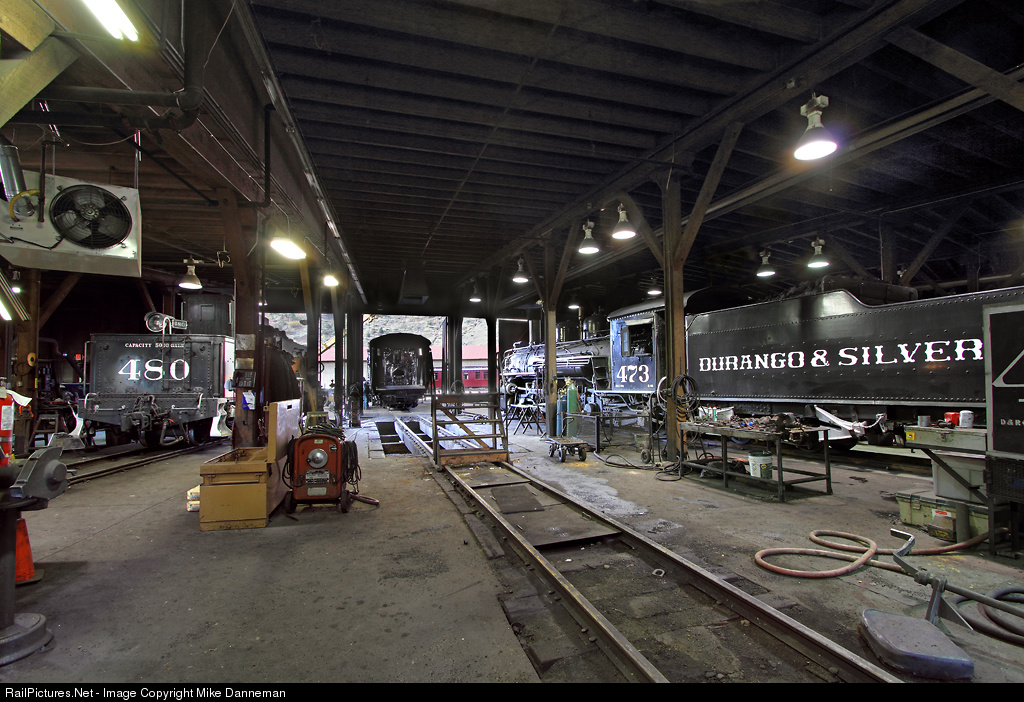 A view inside the Durango & Silverton Narrow Gauge Railroad’s Durango roundhouse on October 15, 2014, sees several locomotives in different states of repair. On the right is 2-8-2 Mikado K-28 No. 473 being used as a back up locomotive for the single train being operated to Silverton by this late-season date. Just outside is K-36 No. 481, sans tender, getting appliances and other parts removed prior to a major off-season overhaul. The tender of sister locomotive No. 480 sits in the next stall on the left.