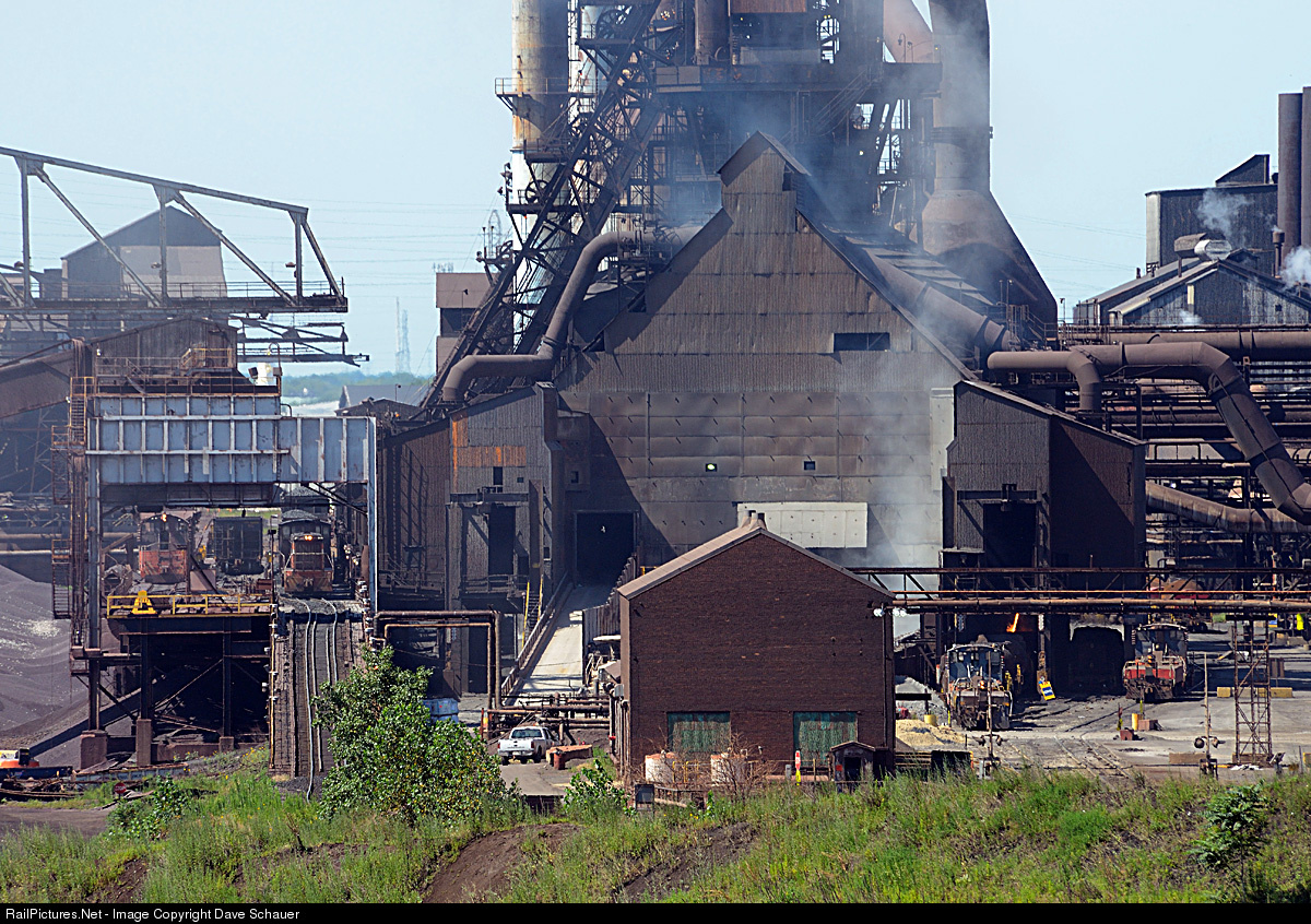 There is lots to see in this view of a former Republic Steel blast furnace now operated by ArcelorMittal. On the left raw materials including iron ore and coke are delivered to the furnace while molten iron is loaded into special bottle cars on the right. Three slug sets and a single SW900 work the furnace on this day.