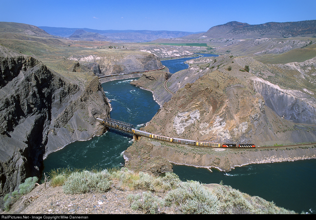 In rugged Black Canyon, a westbound Canadian National freight crosses the Thompson River west of Ashcroft, British Columbia, on June 25, 2006, powered by EMD SD60F No. 5546 and GMD SD40-2W No. 5358.