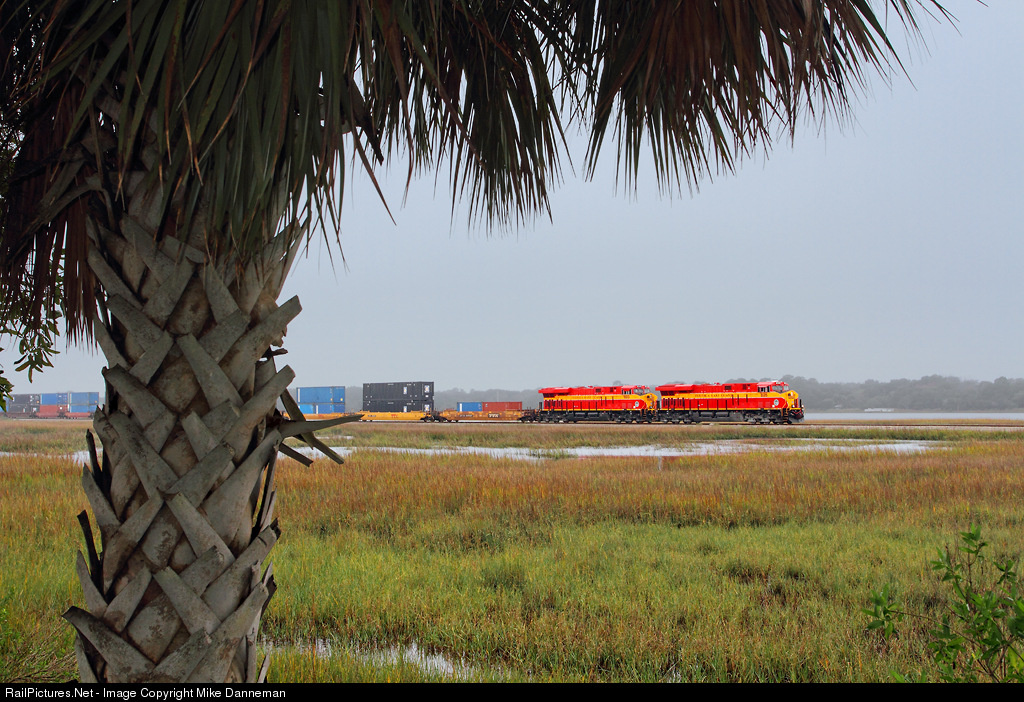 Florida East Coast train No. 210 rumbles through foggy wetlands at St. Augustine, Florida, on January 13, 2015. Two new GE ES44C4s power the northbound train—Nos. 805 and 803.