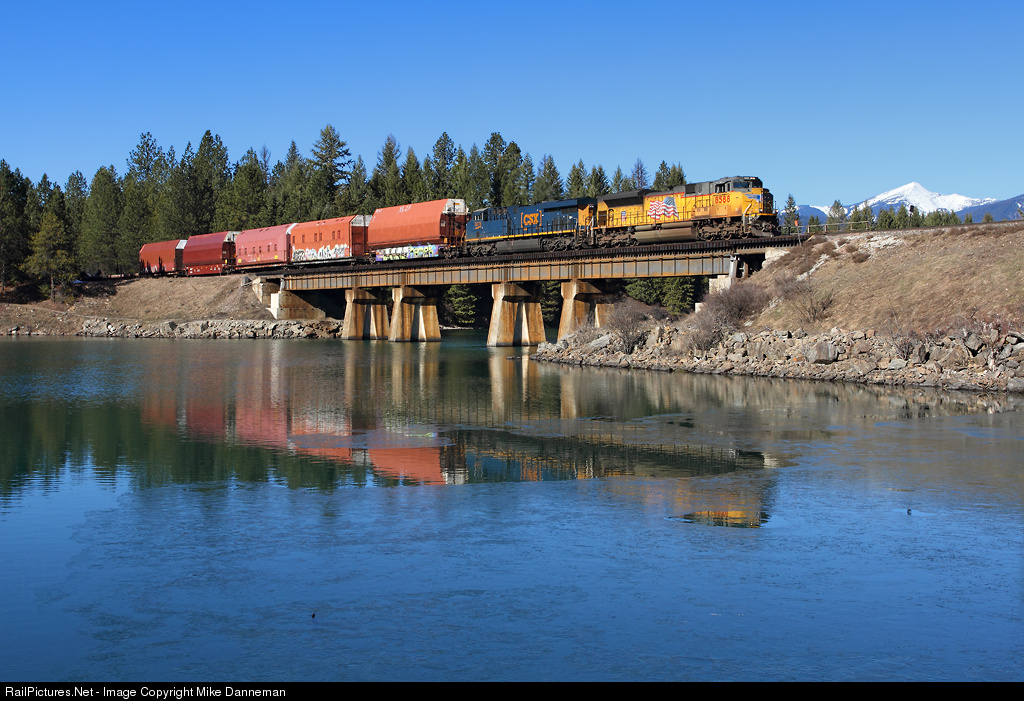 Heading eastbound on Montana Rail Link’s Fourth Subdivision at Trout Creek, Montana, on February 22, 2015, is a BNSF JINBWIC “Boeing Train” crossing the bridge at Milepost 55 over Trout Creek. Powering the train is an unusual pair of locomotives for this route—Union Pacific EMD SD70ACe No. 8588 and CSX GE ES44AC-H No. 3078.
