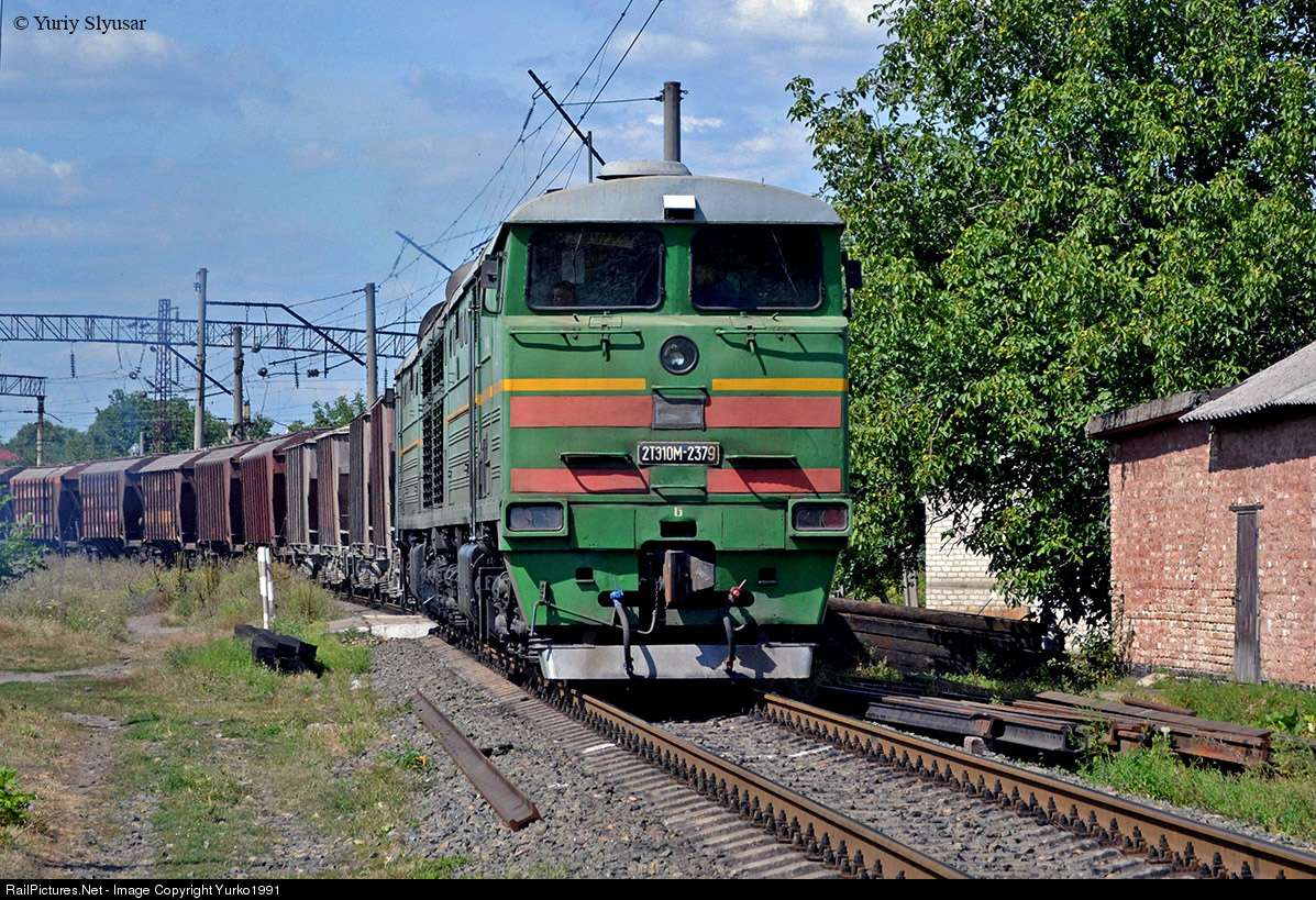 | The diesel locomotive 2TE10M-2379 departing from Tsvitkove station toward the Khrystynivka station. This diesel locomotive was built 1985 in Lugansk Locomotive Works (Luganskteplovoz), and this diesel locomotive working in depot TCH-6 Khrystynivka(Odesa' railway / Odeska zaliznytsya). |